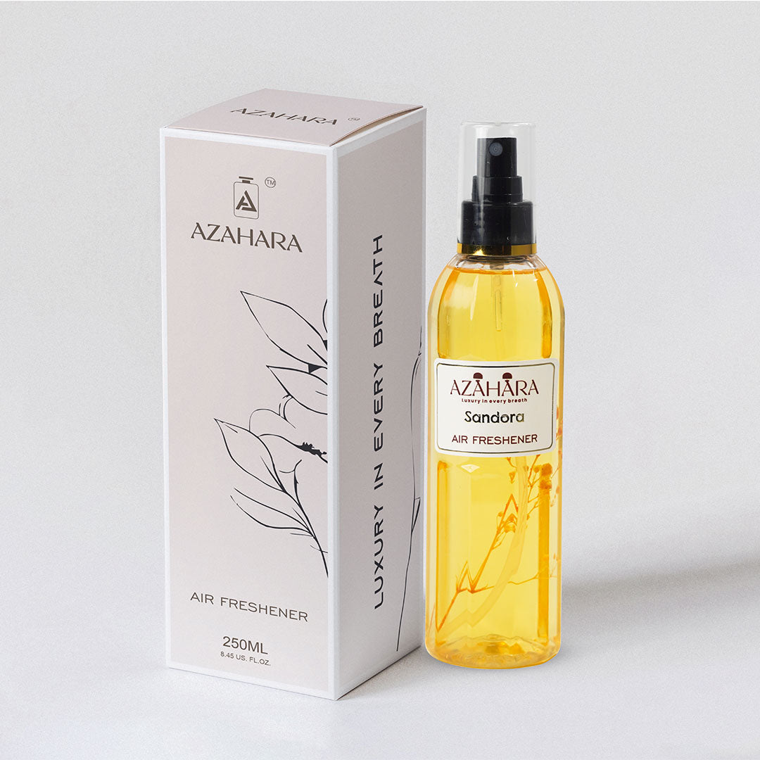 Infuse your space with the warm and calming aroma of sandalwood. The Sandora Air Freshener by Azahara is a timeless blend of earthy and soothing notes that create a sense of peace and relaxation, leaving your surroundings refreshed and inviting. Refresh your space with Azahara (Sandora) 250ML Air Freshener.