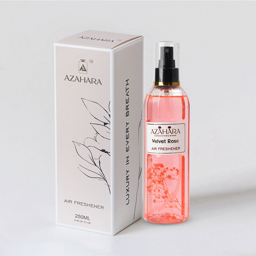 Infuse your space with the romantic and uplifting essence of roses. The Velvet Rose Air Freshener by Azahara is a timeless blend of floral elegance and refreshing notes that inspire joy, warmth, and serenity—leaving your surroundings beautifully revitalized and inviting. Refresh your space with Azahara Velvet Rose 250ML Air Freshener.